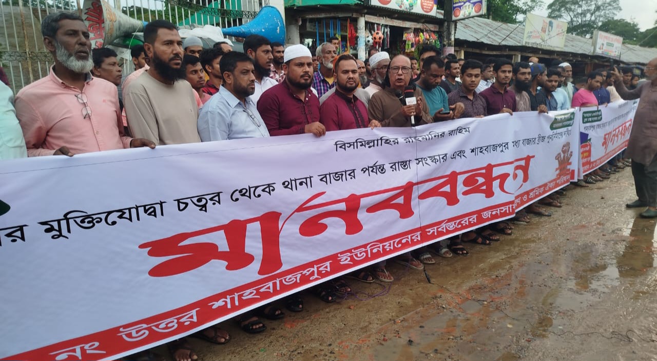 বড়লেখায় বেহাল শাহবাজপুর-থানাবাজার সড়ক সংস্কারের দাবিতে মানববন্ধন