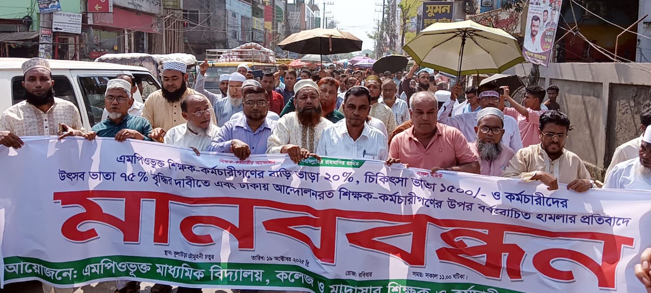 কুলাউড়ায় এমপিওভুক্ত শিক্ষক-কর্মচারীদের বিশাল মানববন্ধন