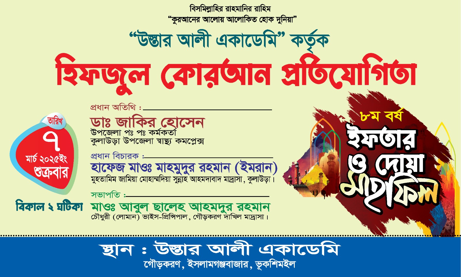 আগামী ৭ই মার্চ শুক্রবার উস্তার আলী একাডেমি কর্তৃক কোরআন তেলাওয়াত ও হামদ নাত প্রতিযোগিতা সকাল ১০ ঘটিকায় অনুষ্ঠিত হবে। একাডেমির